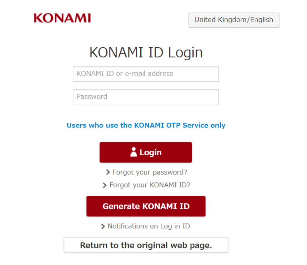 Wenn du bereits eine KONAMI ID hast, kannst du dich mit deren Anmeldedaten, anmelden.