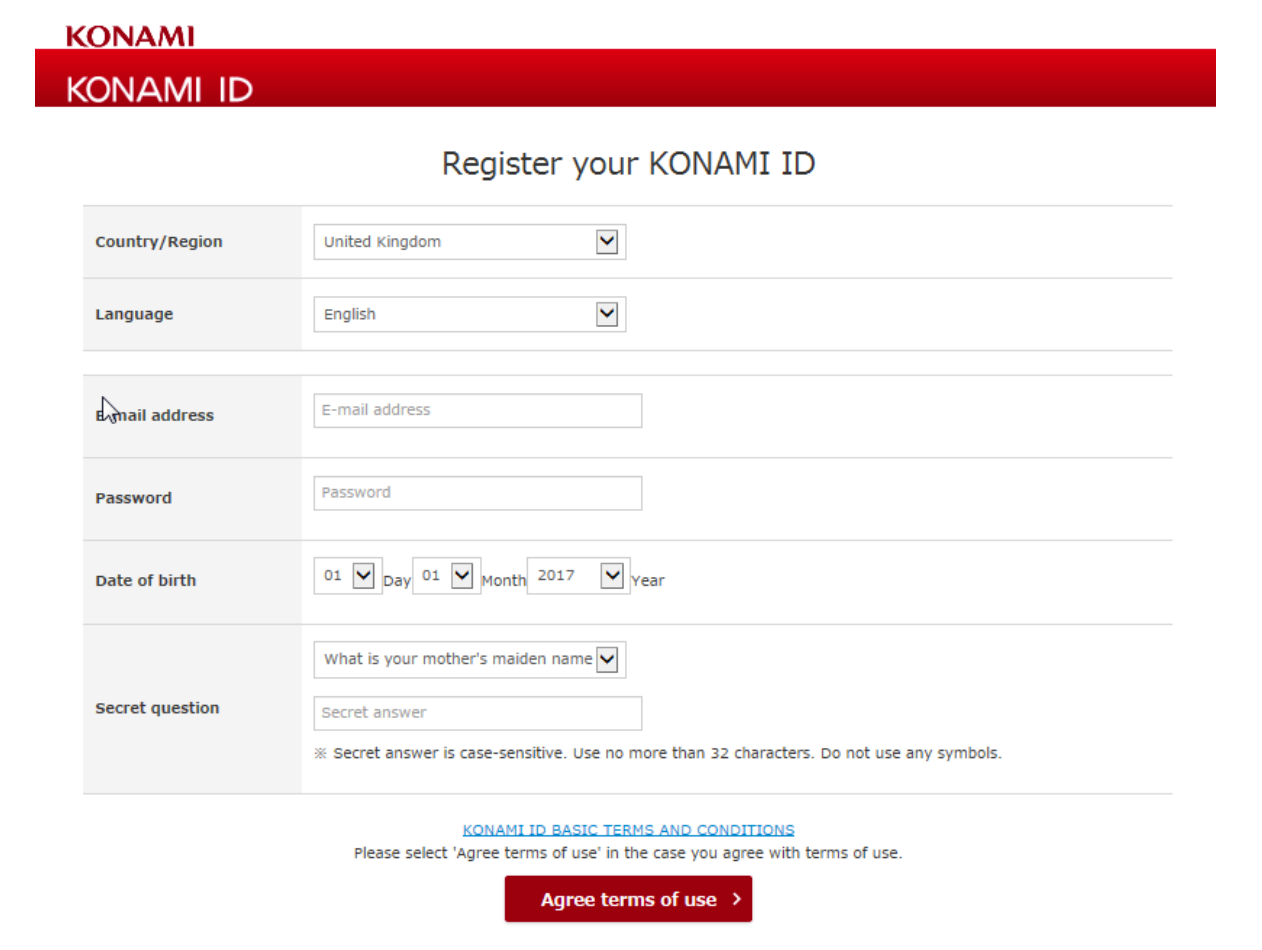 Wenn du noch keine KONAMI ID hast und auf "KONAMI ID erstellen" geklickt hast, erscheint der folgende Bildschirm: